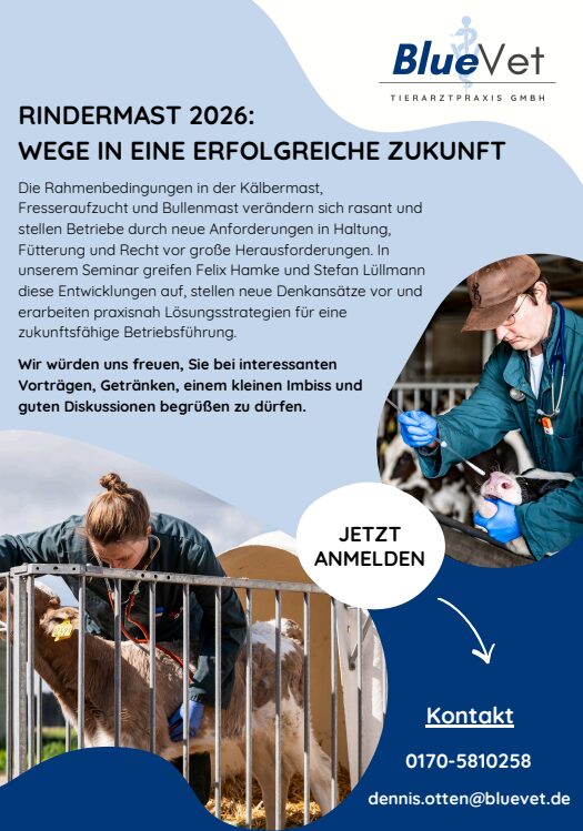Die Rahmenbedingungen in der Kälbermast, Fresseraufzucht und Bullenmast verändern sich rasant und stellen Betriebe durch neue Anforderungen in Haltung, Fütterung und Recht vor große Herausforderungen. In unserem Seminar greifen Felix Hamke und Stefan Lüllmann diese Entwicklungen auf, stellen neue Denkansätze vor und erarbeiten praxisnah Lösungsstrategien für eine zukunftsfähige Betriebsführung.